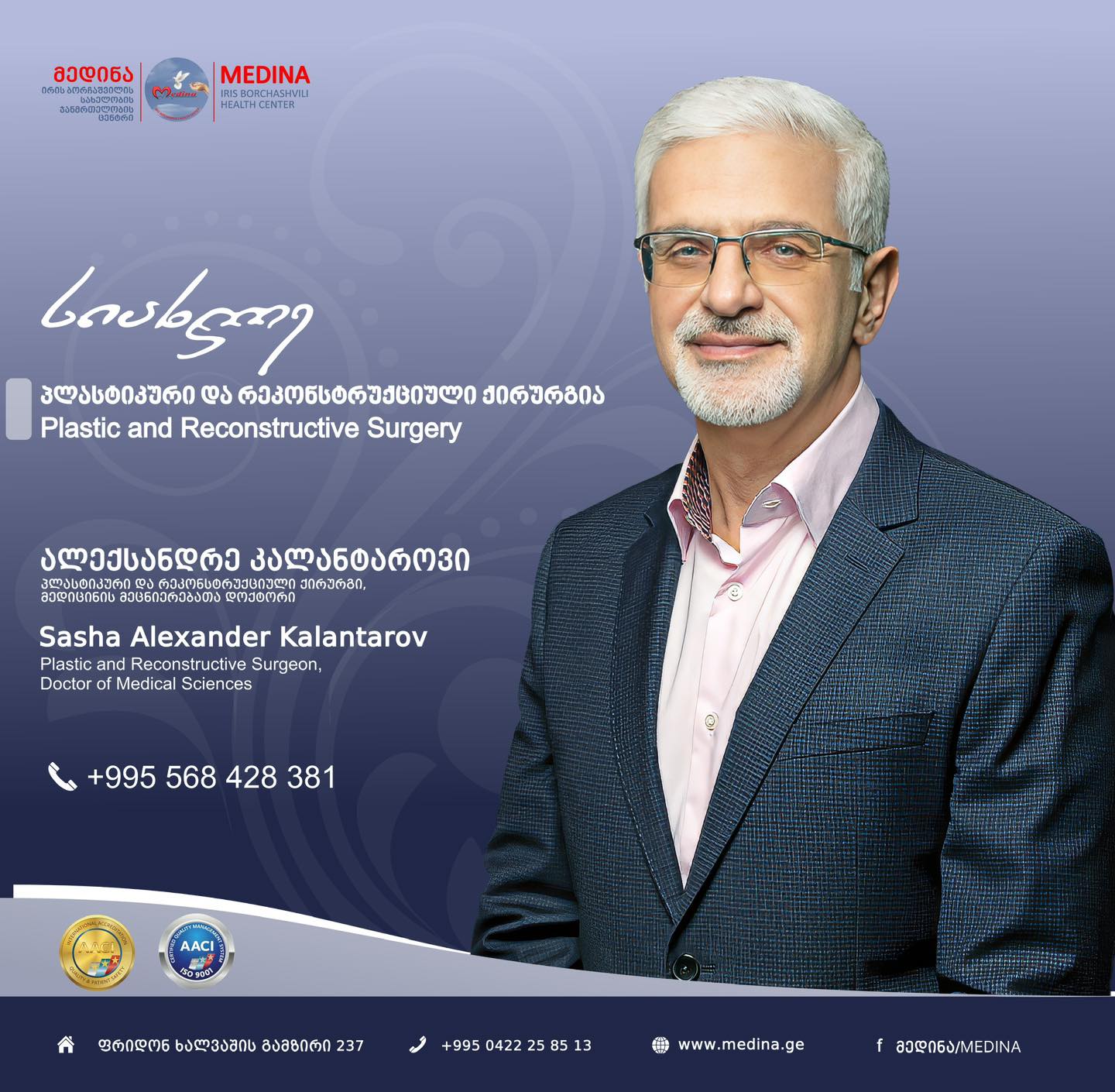ირის ბორჩაშვილის ჯანმრთელობის ცენტრ „მედინაში“ შესაძლებლობა გაქვთ გაიაროთ კონსულტაცია და მიიღოთ მაღალი ხარისხის პლასტიკურ-ქირურგიული მომსახურება საქართველოში ერთ-ერთი წამყვანი პლასტიკური და რეკონსტრუქციული ქირურგისგან – ექიმ ალექსანდრე (საშა) კალანტაროვისგან.